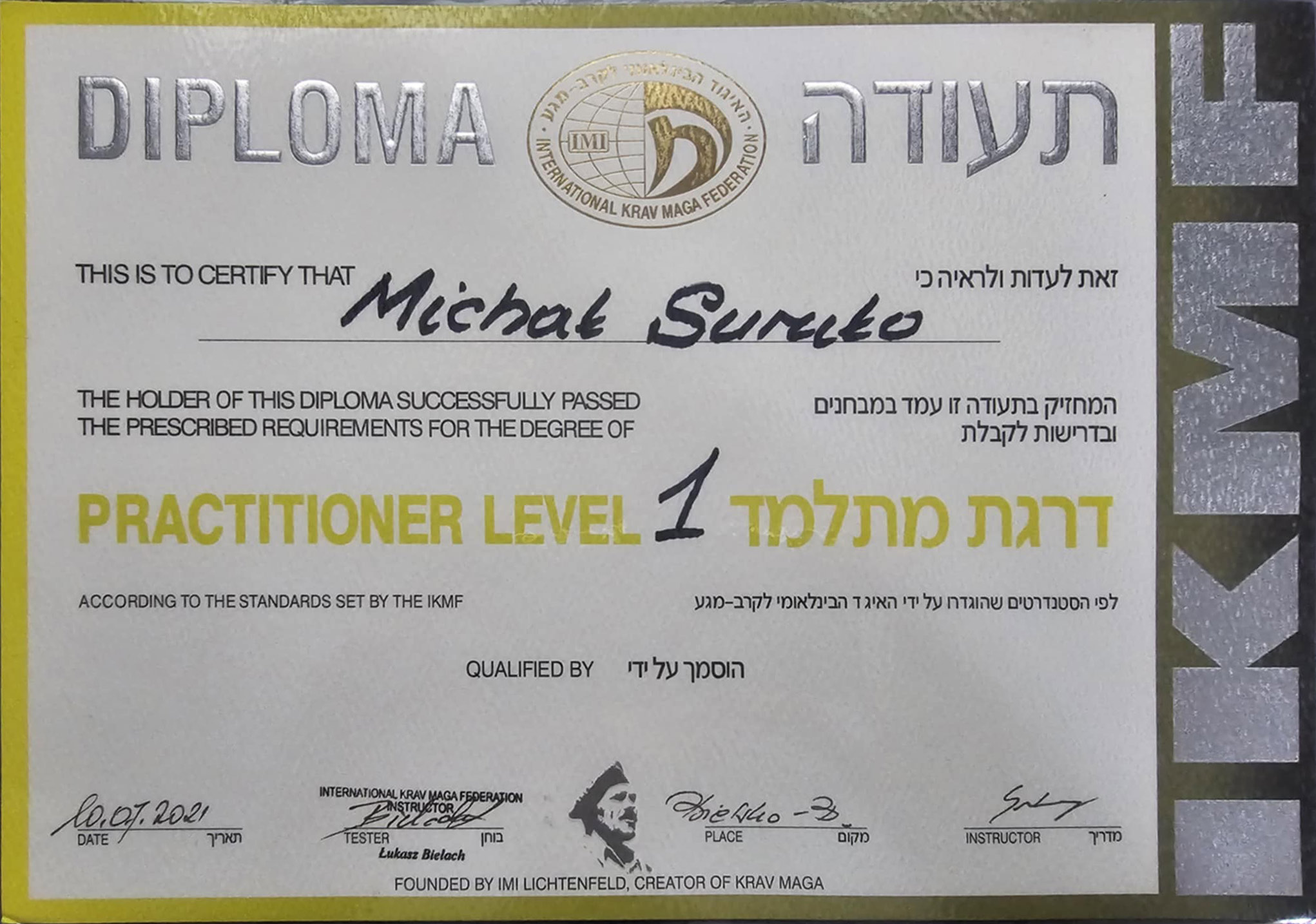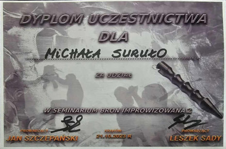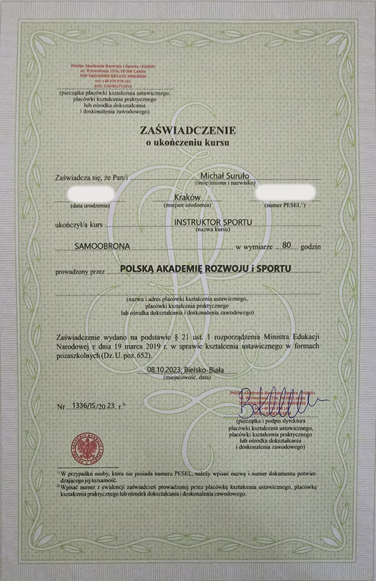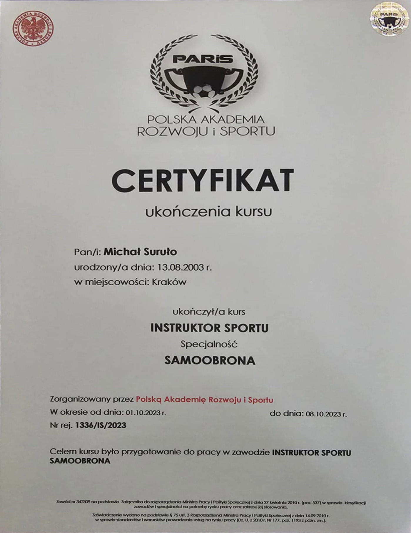 - Instruktor Sportu specjalizacji Samoobrona (Uprawnienia polskie).