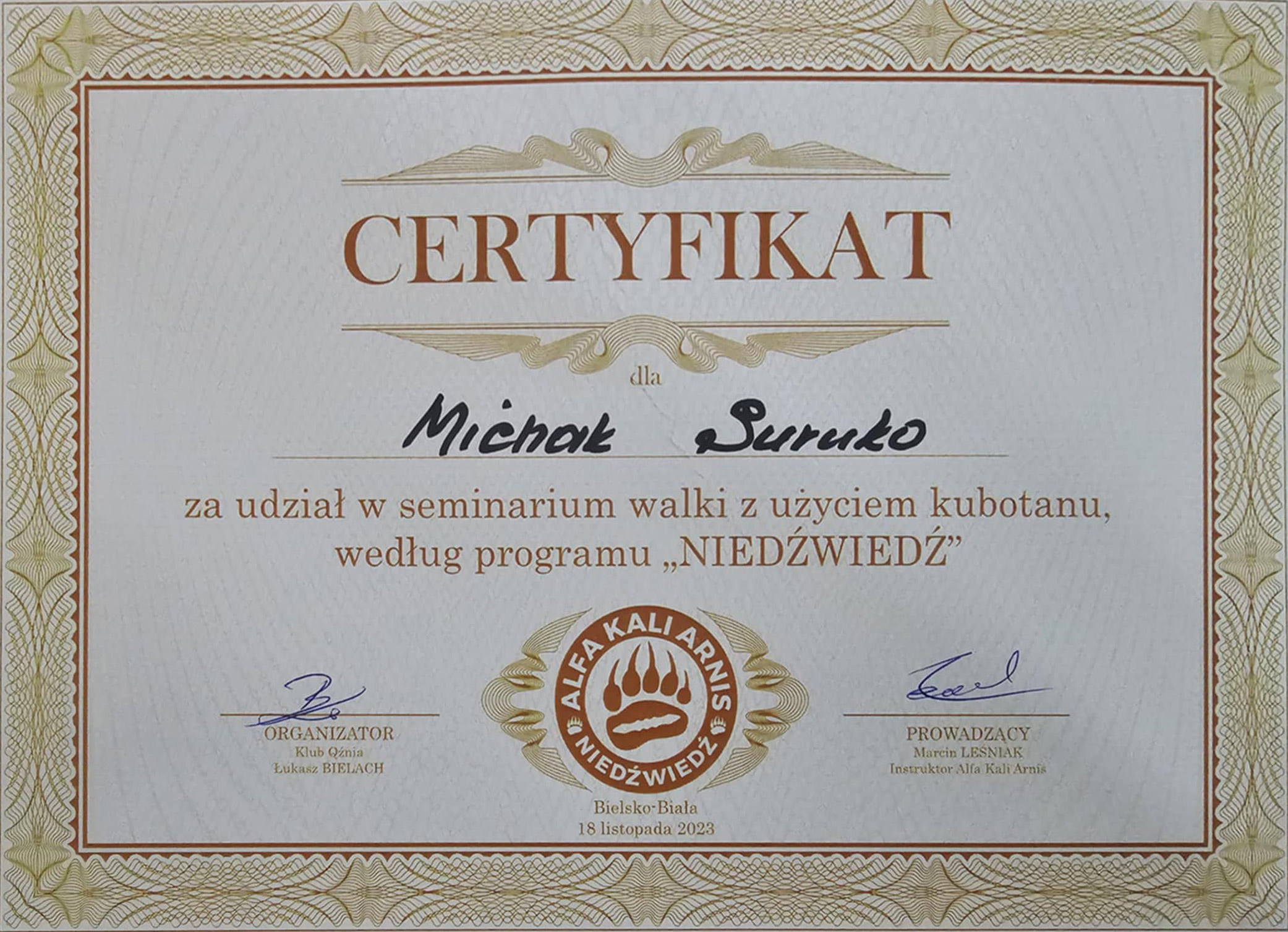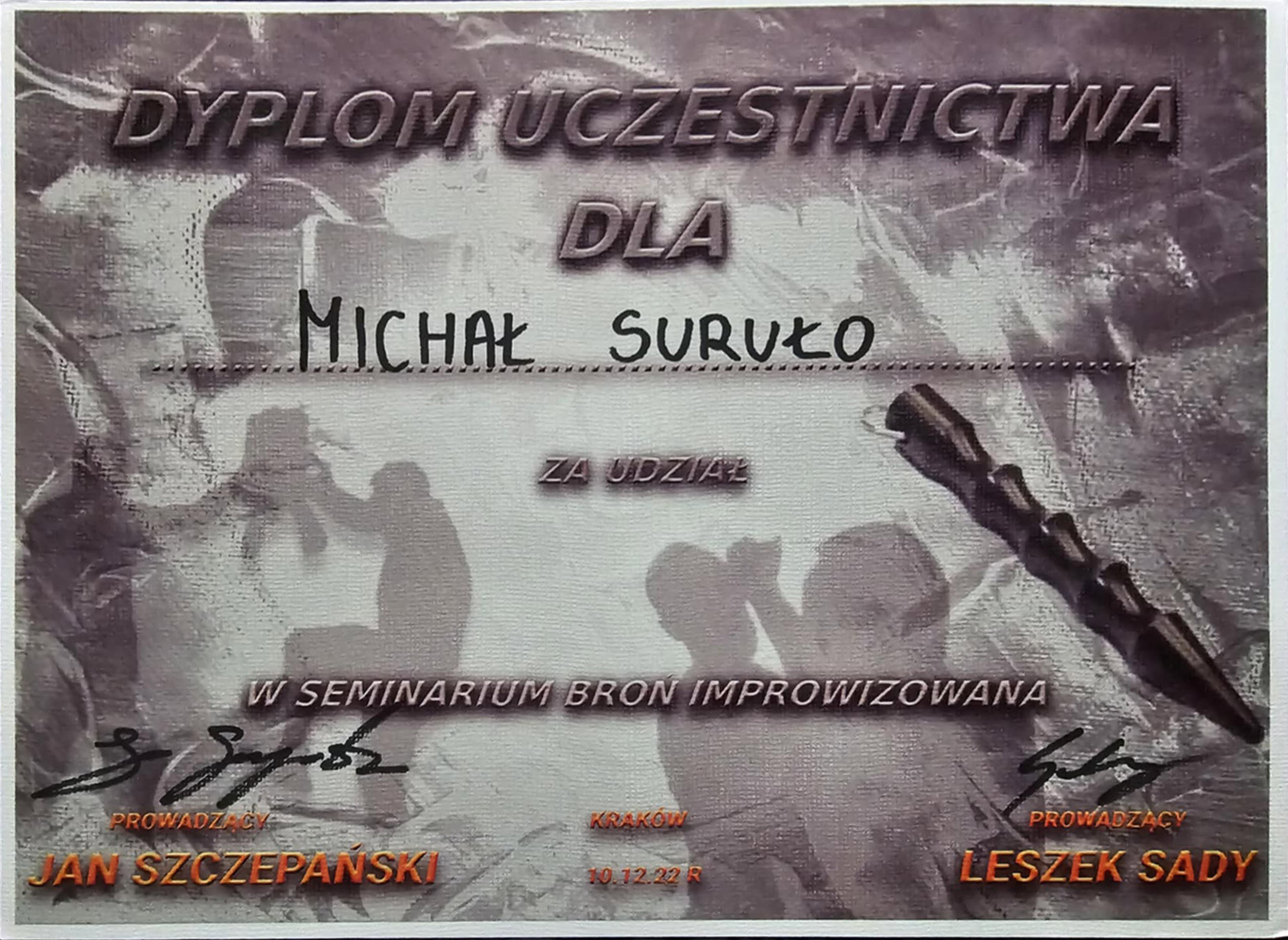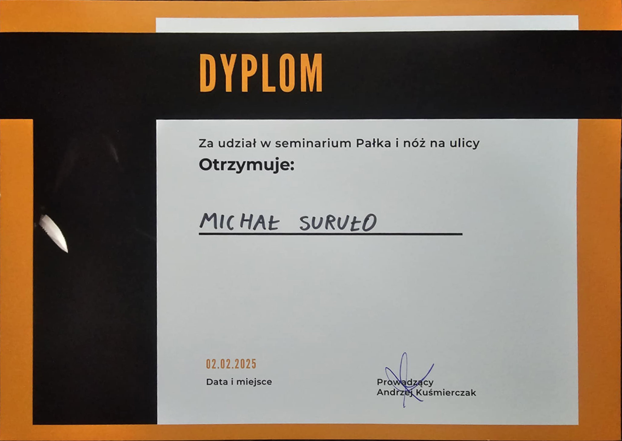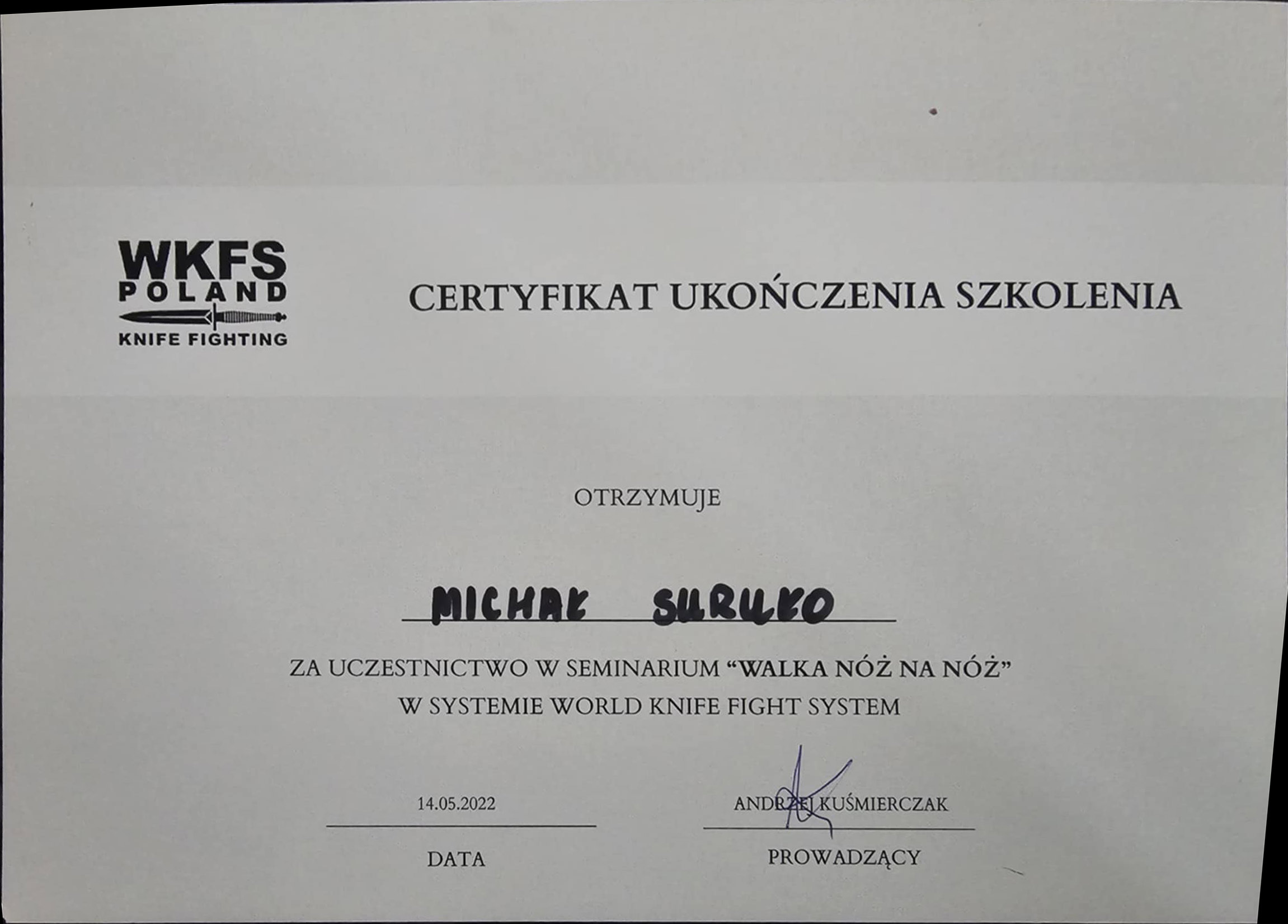 - Instruktor Sportu specjalizacji Samoobrona (Uprawnienia polskie).