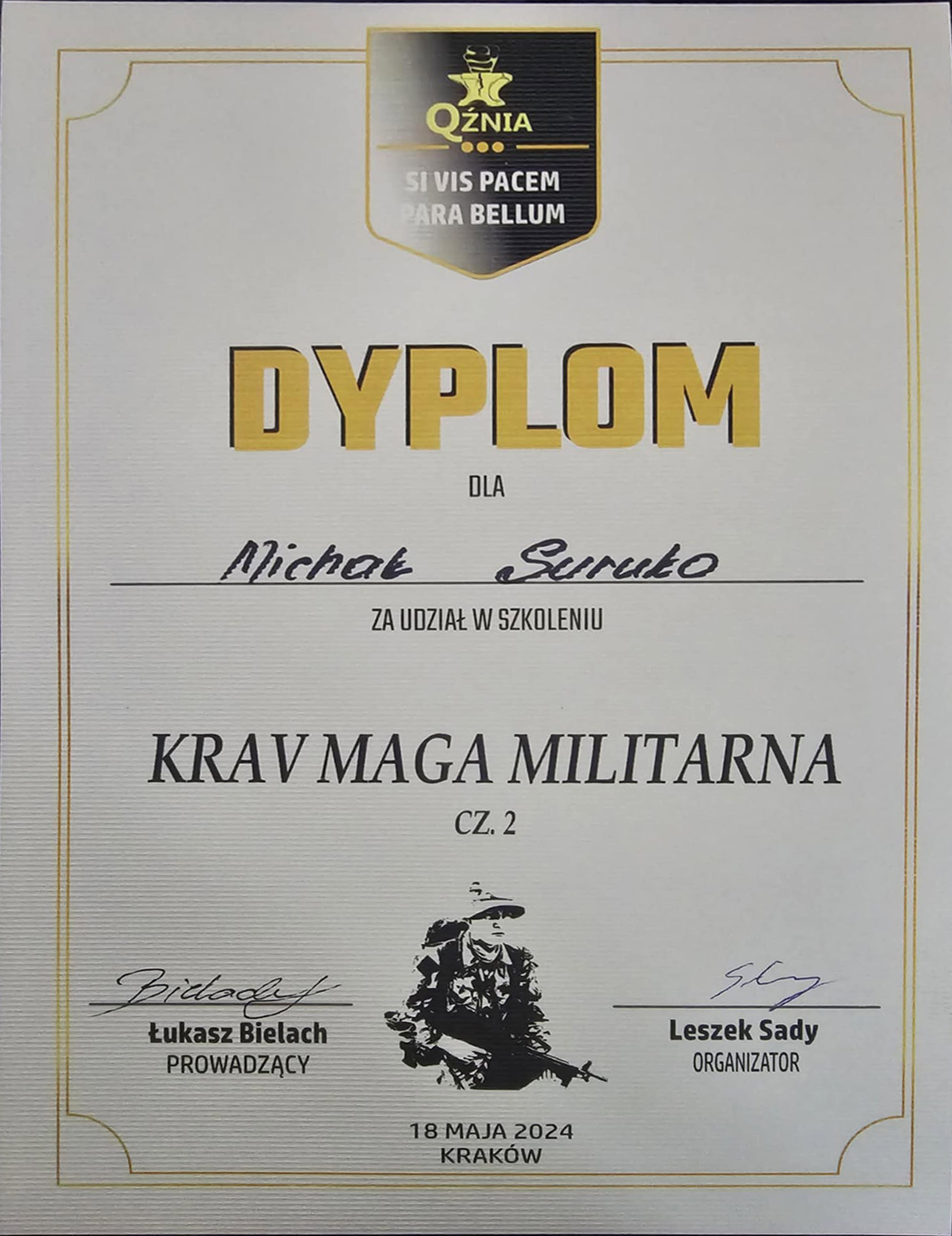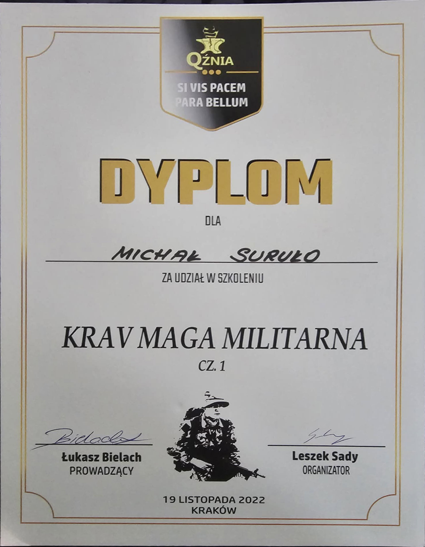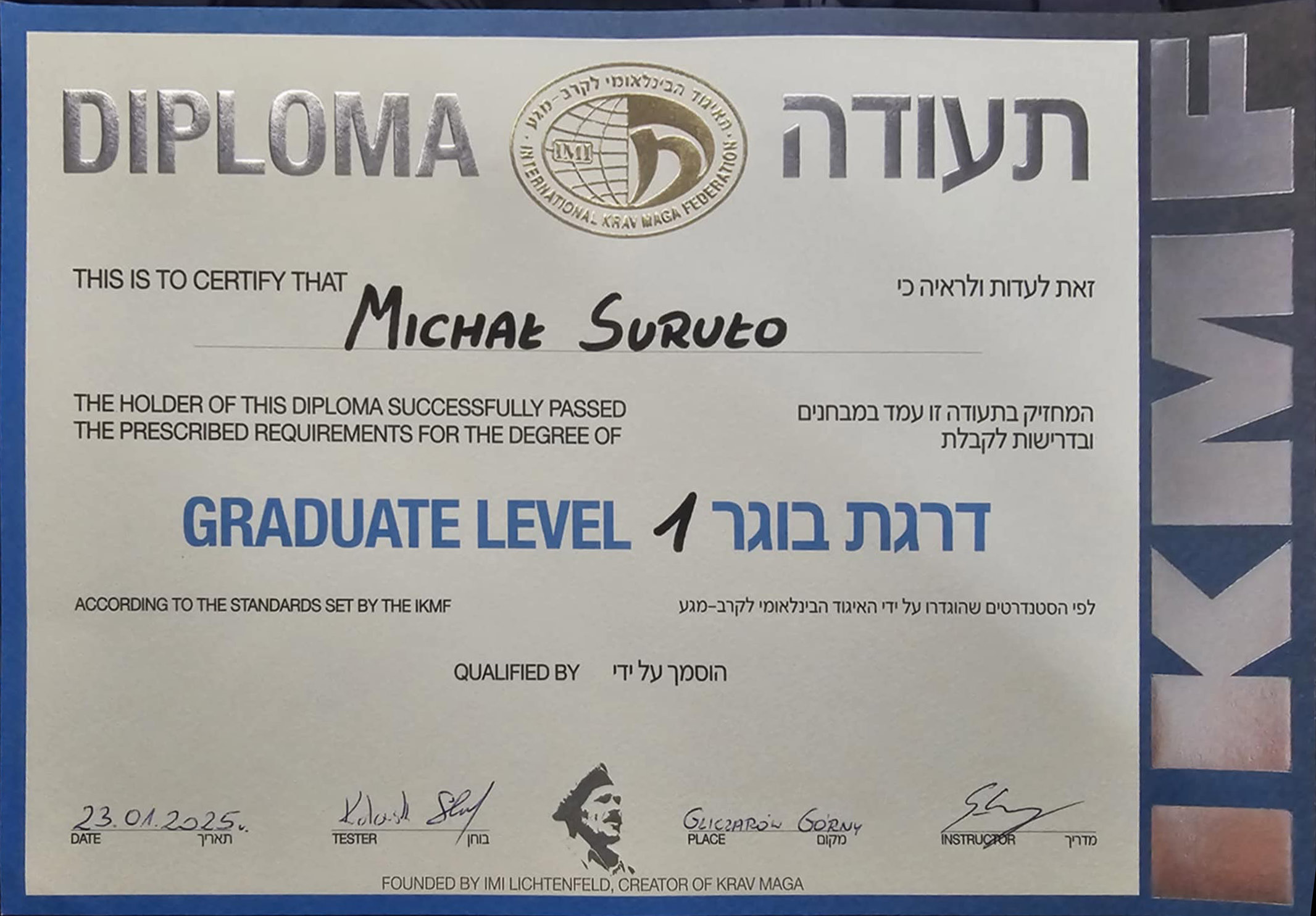 Michał Suruło – Asystent Instruktora Krav Maga poziom G1. Krav Maga jest jego wieloletnią pasją, co bezpośrednio przekłada się na sposób przekazywania wiedzy studentom.