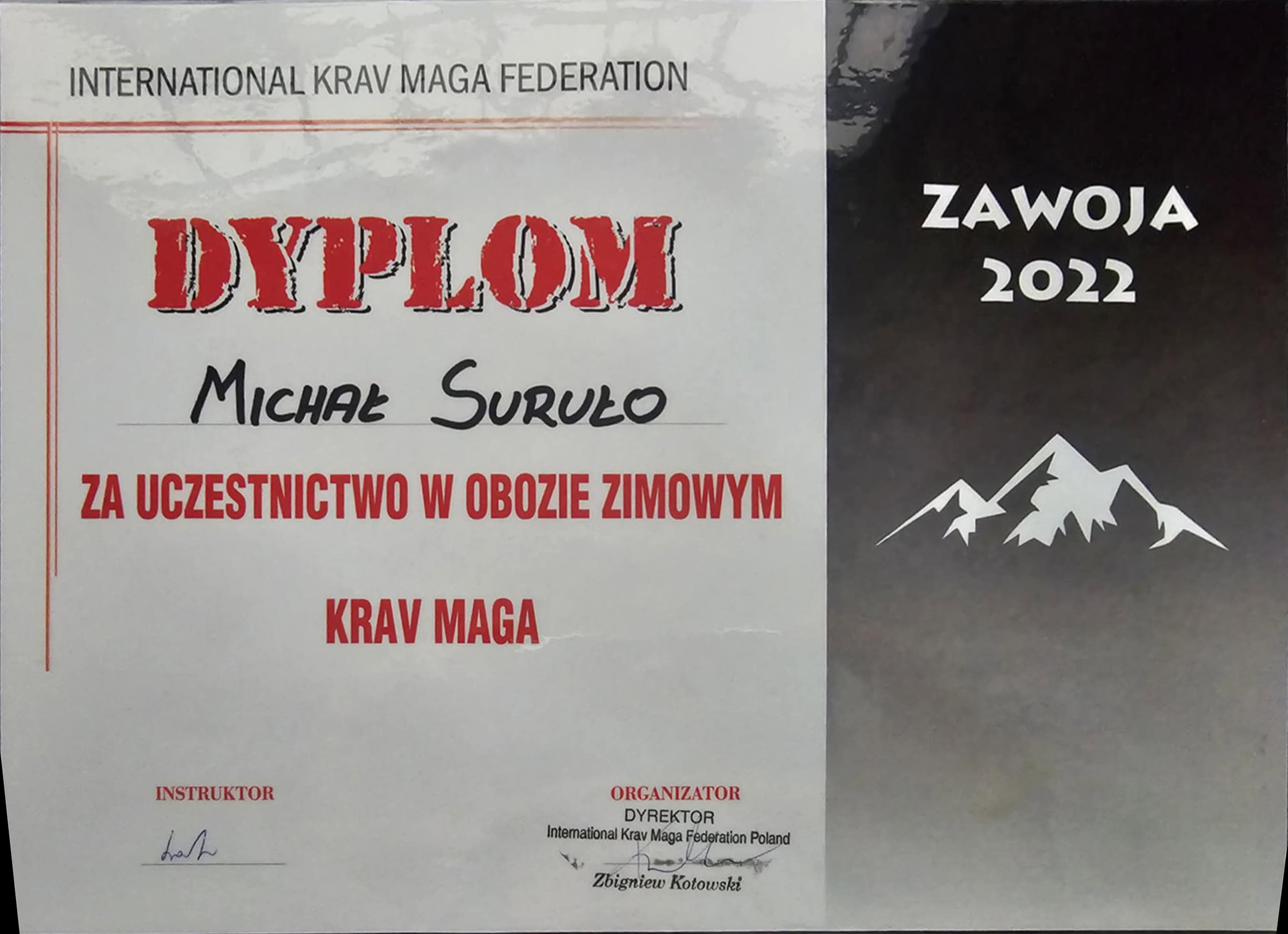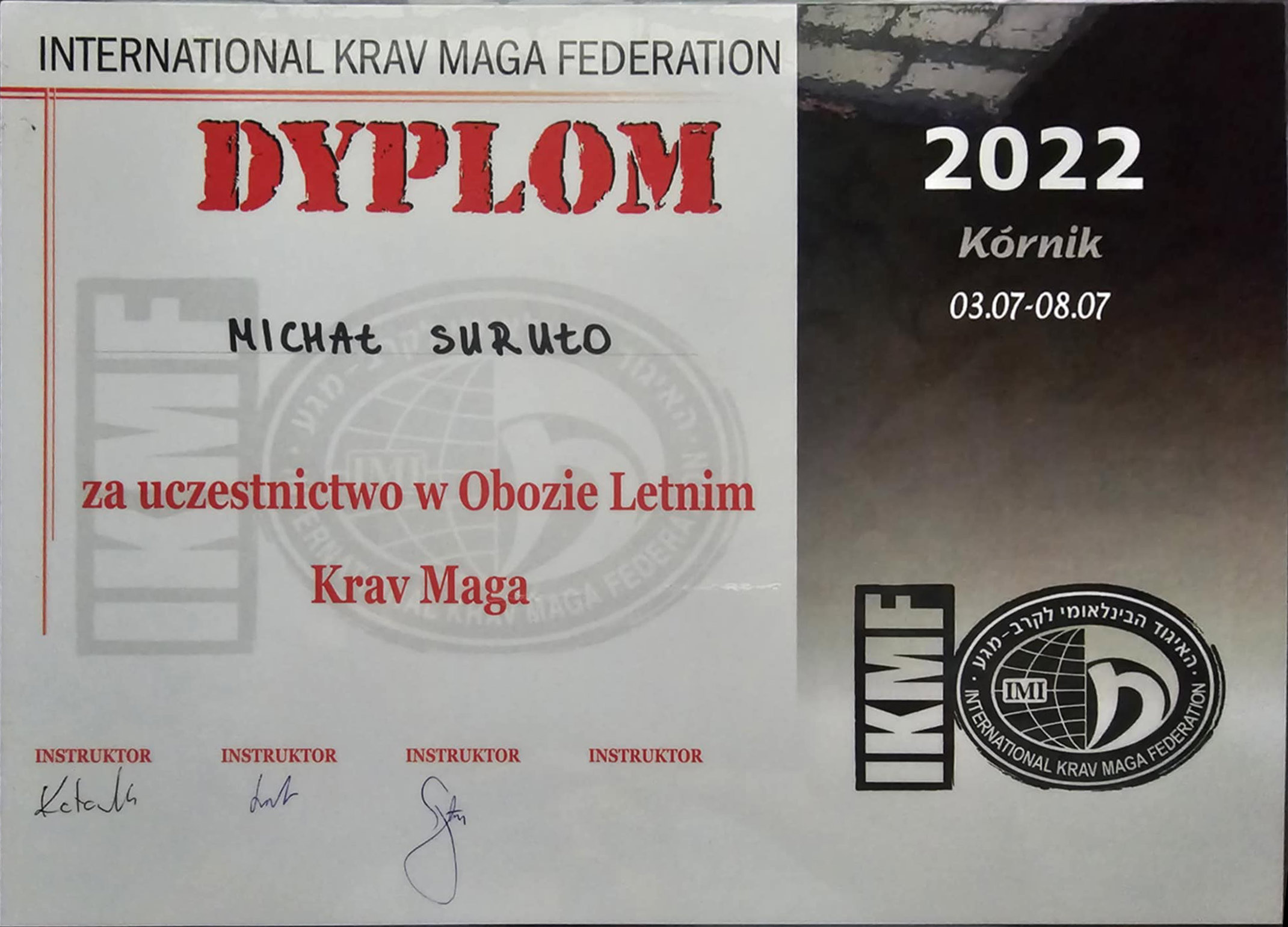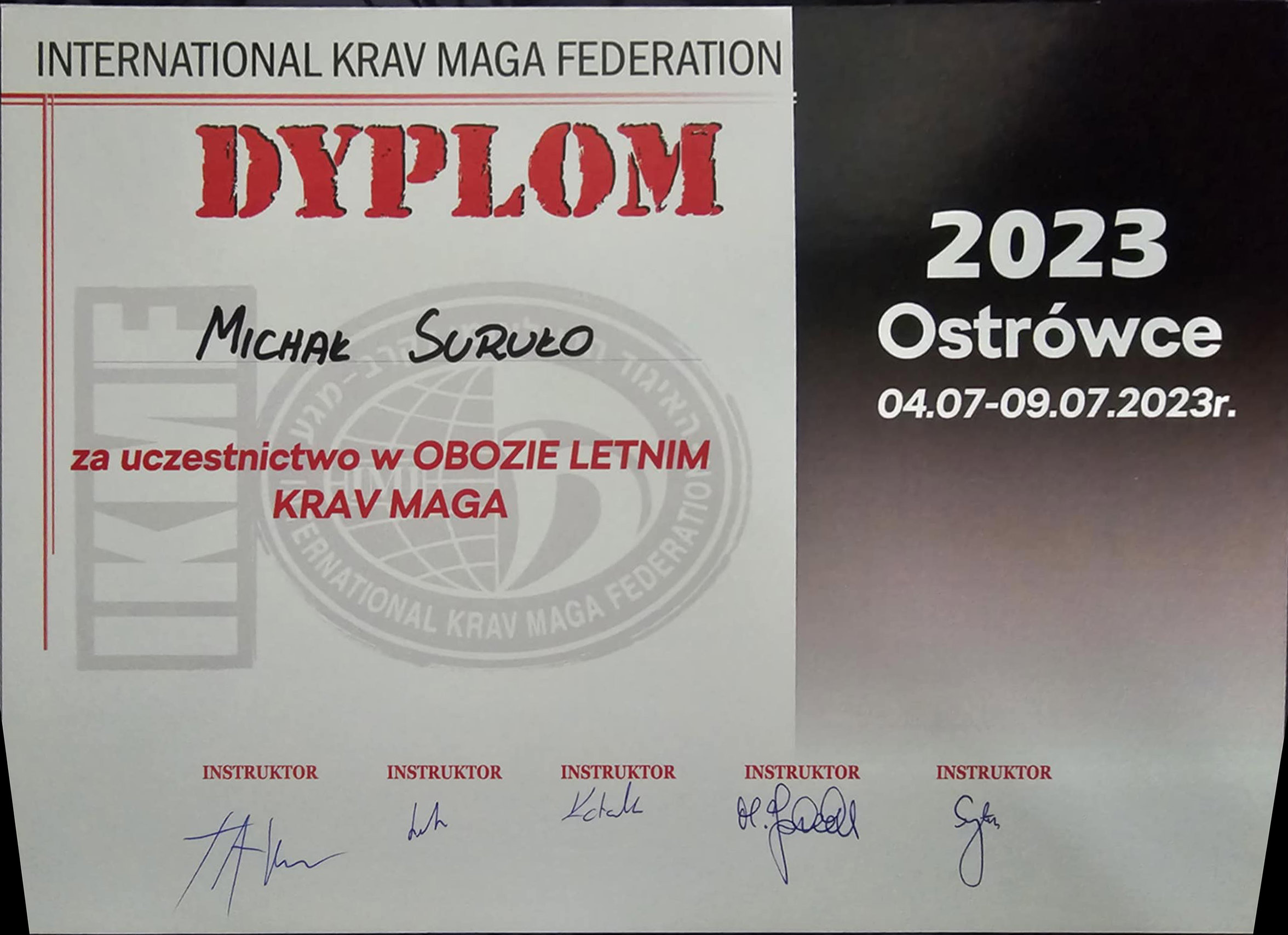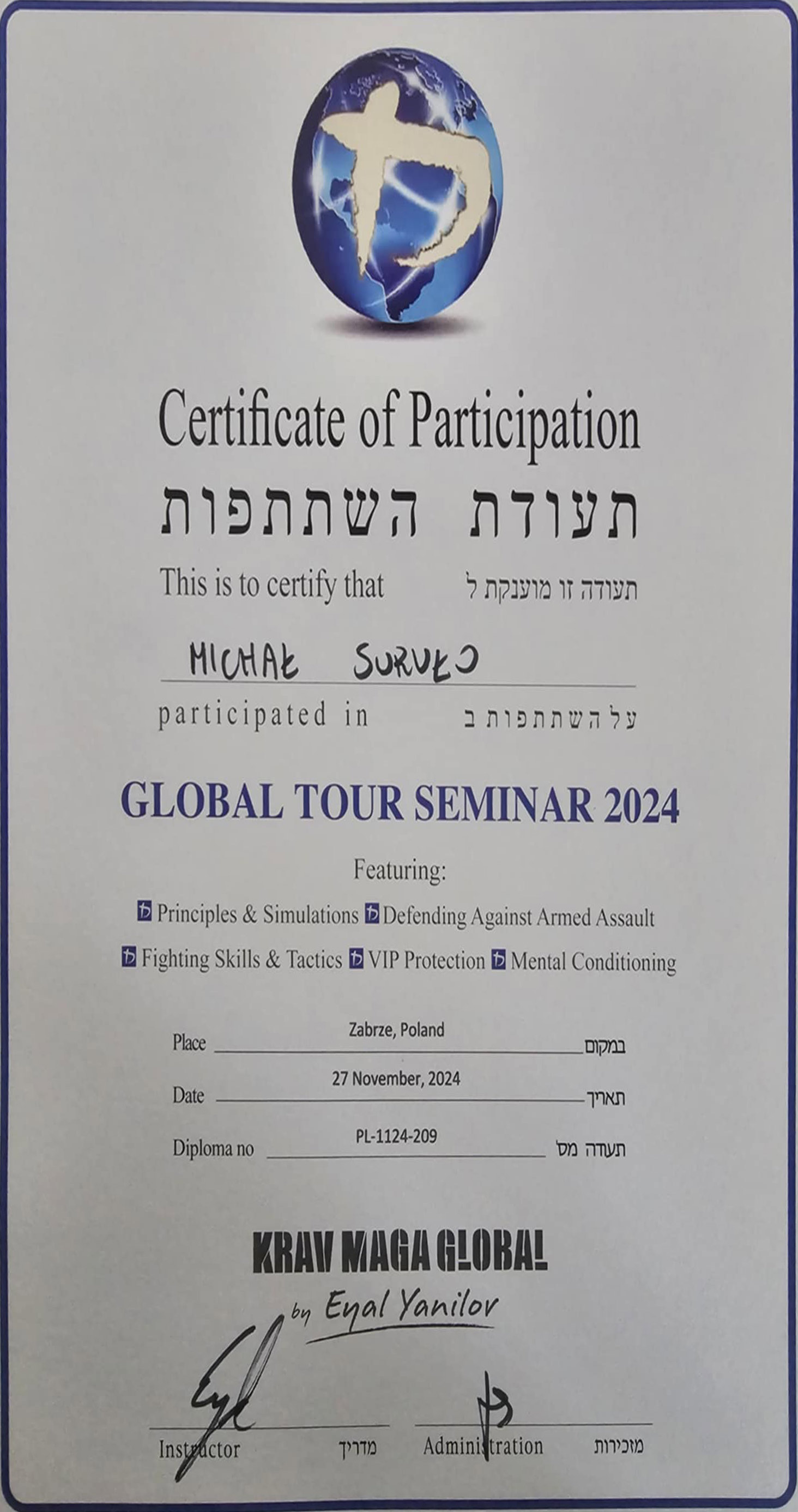 Michał Suruło – Asystent Instruktora Krav Maga poziom G1. Krav Maga jest jego wieloletnią pasją, co bezpośrednio przekłada się na sposób przekazywania wiedzy studentom.