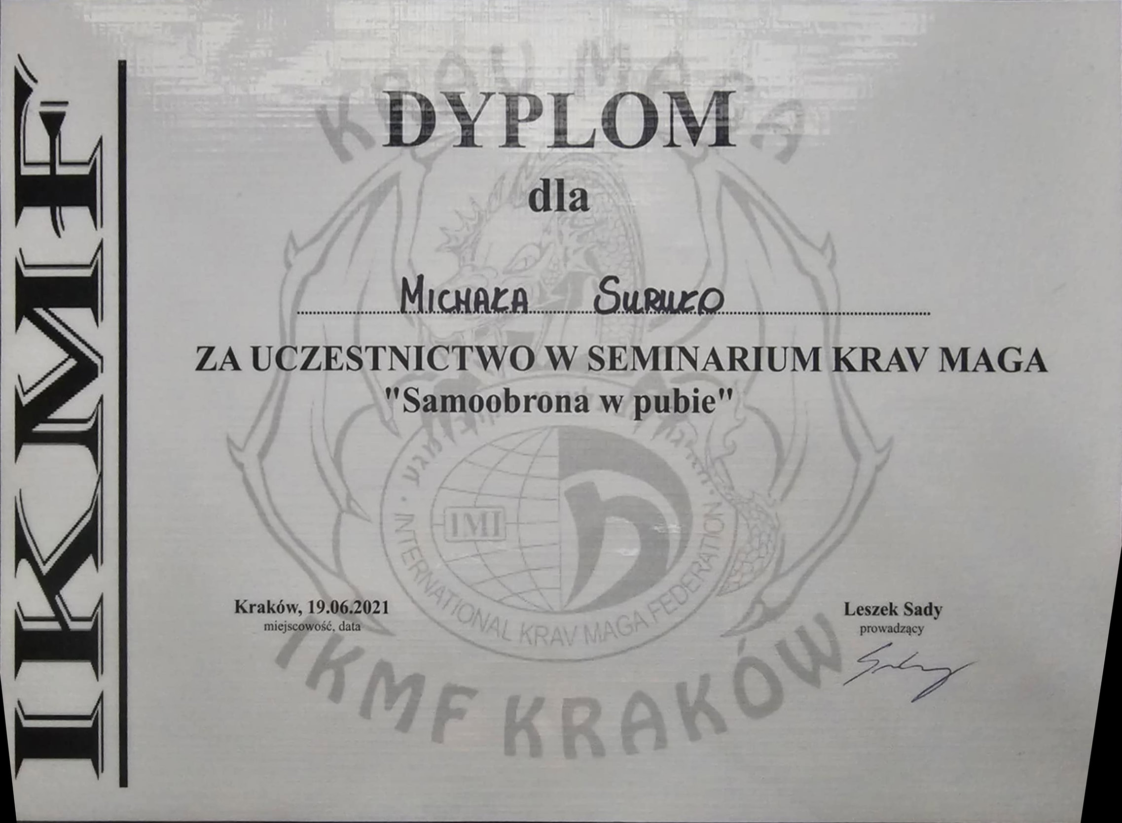 - Uczestniczył w licznych seminariach Krav maga (m.in użycie noża w samoobronie, walka w pubie, pałka teleskopowa w samoobronie, strzelanie z broni krótkiej).