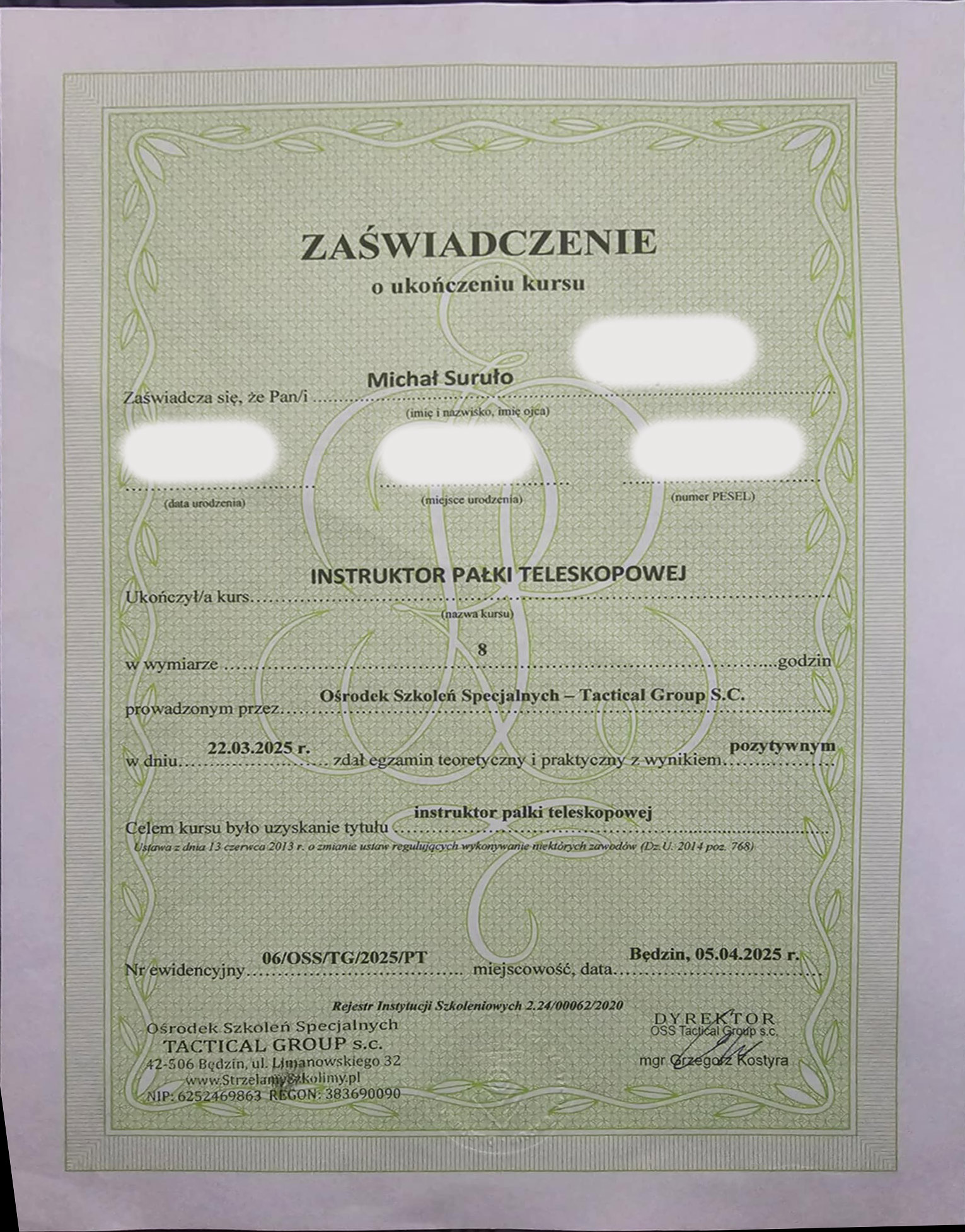 - Instruktor Pałki teleskopowej (Uprawnienia polskie) .